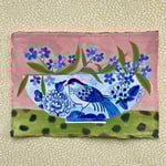 Forget-me-nots in a blue and white bowl with insect and flower decoration.